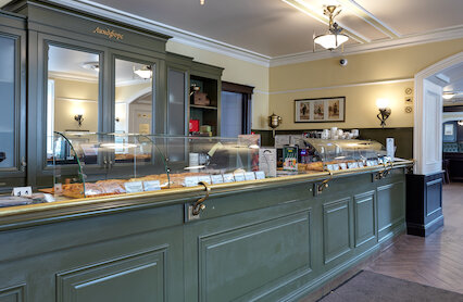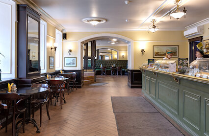 - Миниатюрная кофейня с выпечкой и десертами на набережной канала Грибоедова