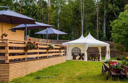 - Летний шатер для свадеб и банкетов на берегу озера в загородном клубе «Стеклянный»