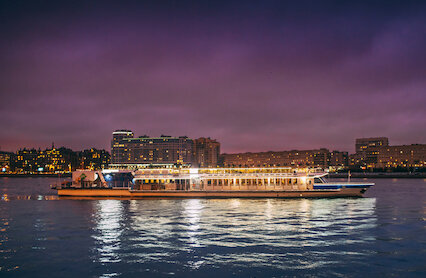 Выбирайте локации у воды или на высоте. Рестораны в исторических доходных домах с мансардными окнами позволяют любоваться крышами и шпилями, а летние террасы на набережных дают вид на тихие рукава Невы. Пешком до них часто ведут освещённые мостики, так что после ужина удобно выйти к воде и продолжить свидание прогулкой. Если нужен более приватный отдых для двоих, рассмотрите речные кораблики-лаунжи: они отплывают вечером, делают небольшой круг и швартуются в центре. При желании можно заказать стол внутри салона с панорамными окнами — получится романтическое свидание «два-в-одном», ужин и мини-круиз.