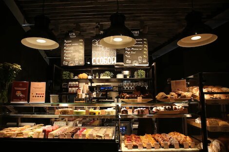 - Сетевое кафе-кондитерская с нарядными десертами и собственной выпечкой в ТРК «Атмосфера»