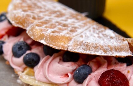 - Камерное сетевое кафе с затейливыми вафлями в районе Садовой