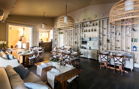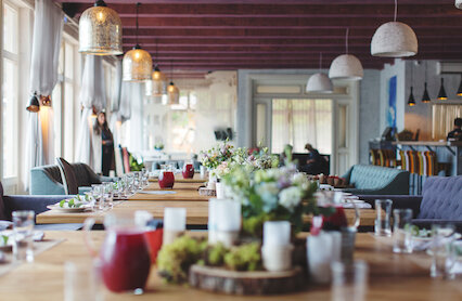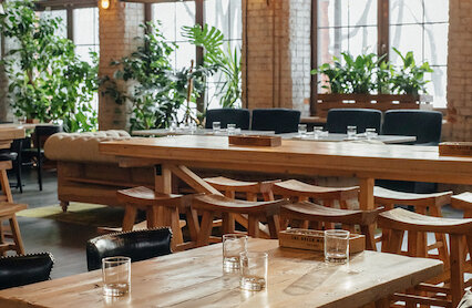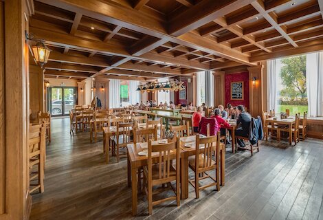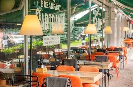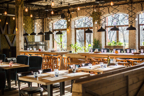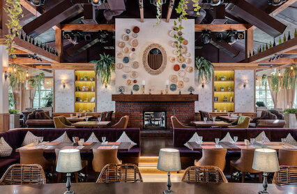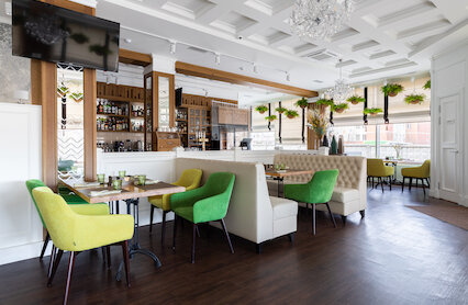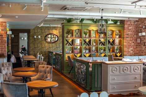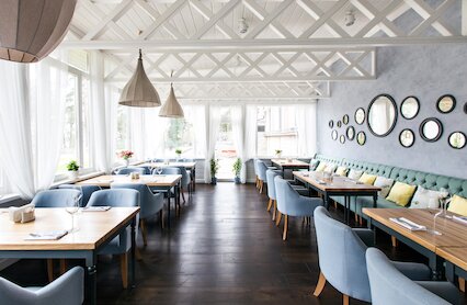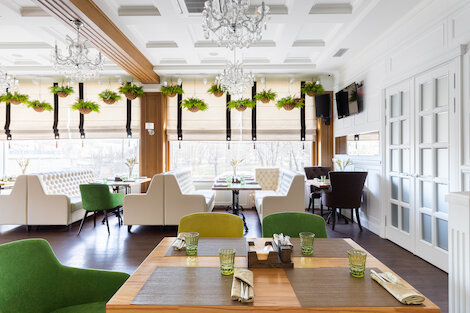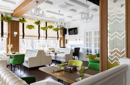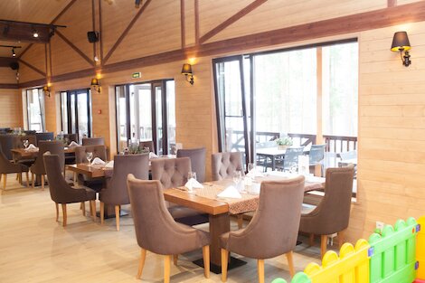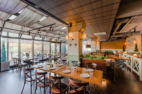 - Просторный семейный ресторан с атмосферой загородного дома, окруженного зеленью