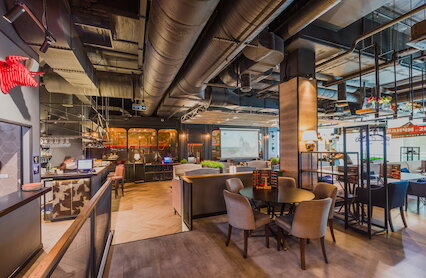 - Гастробар на первом этаже торгового комплекса «Индустриальный», где периодически проводят спортивные трансляции