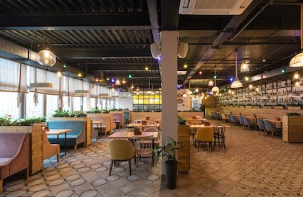 - Масштабный ресторан с собственной пивоварней, концертами и спортивными трансляциями