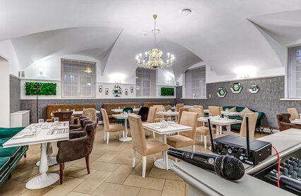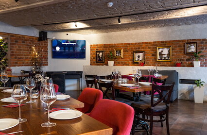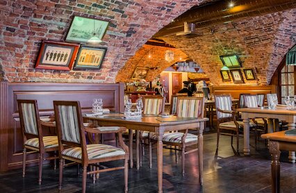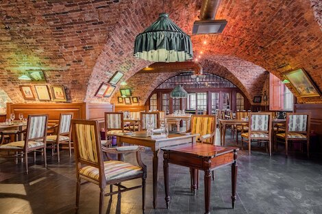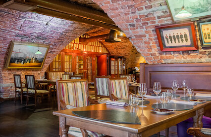 - Солидный банкетный зал с ретро-оформлением и русской кухней