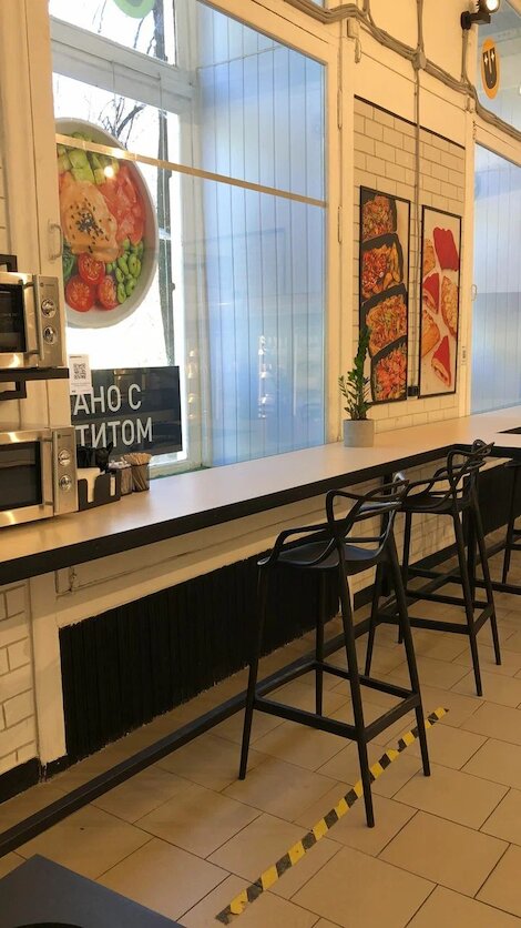 - Окно выдачи с кофе и пончиками в формате to go в «Охта-парке» на улице Людмилы Кедриной