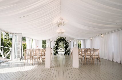- Летний шатер для свадеб и банкетов на берегу озера в загородном клубе «Стеклянный»
