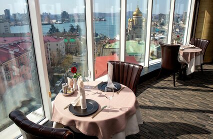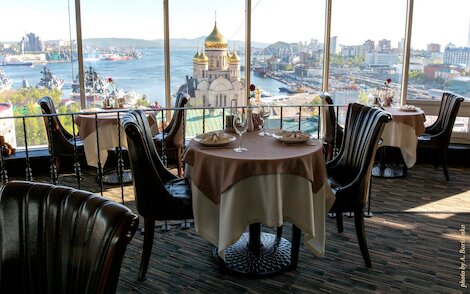 - Элегантный ресторан в классическом стиле с панорамой на бухту